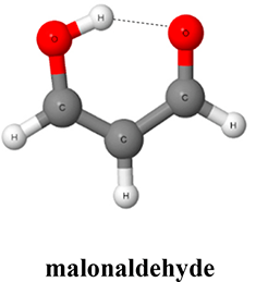 丙二醛分子内S(6)型六元环氢键(O-H···O)。虚线表示氢键。DOI:10.1021/acs.jpca.0c11183