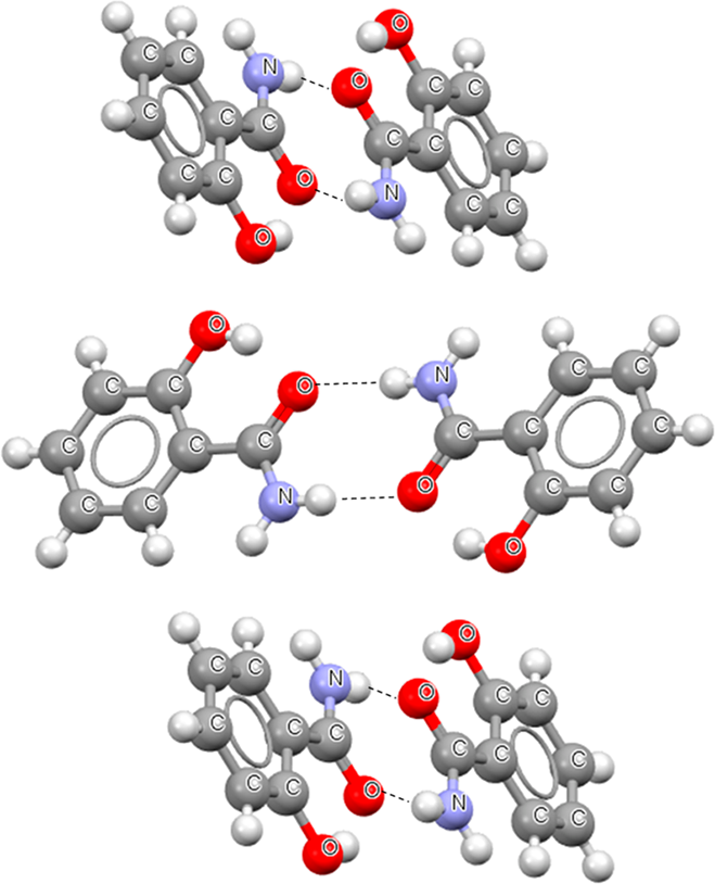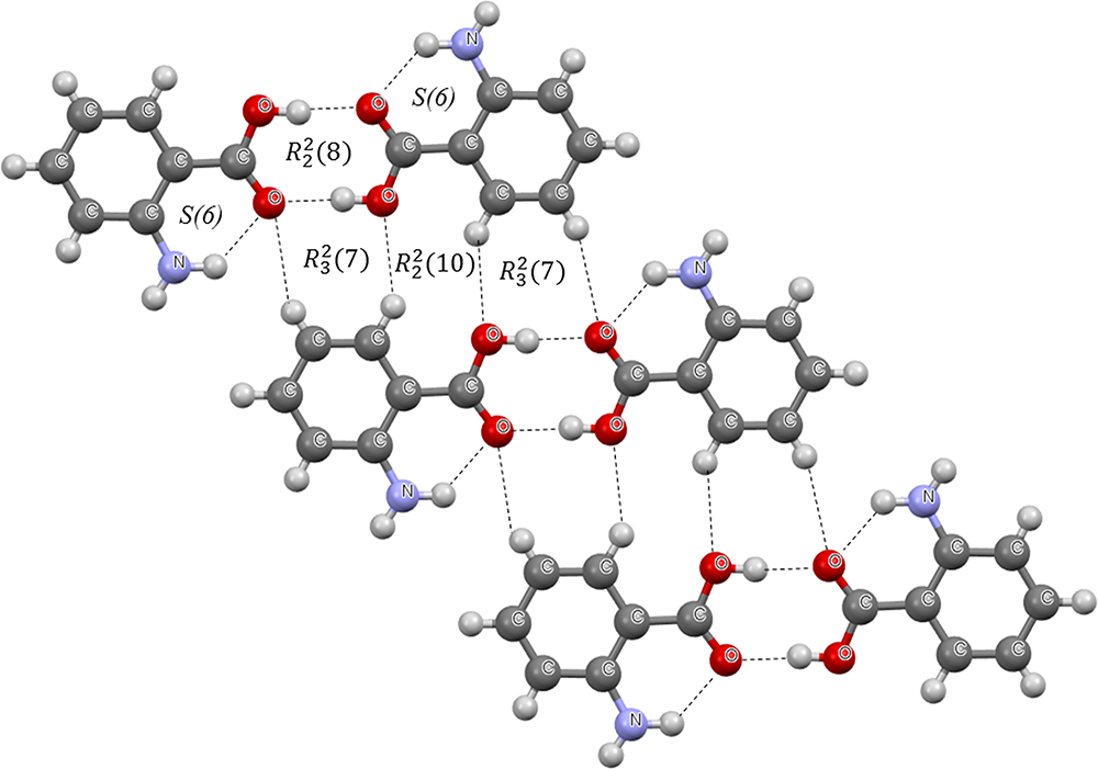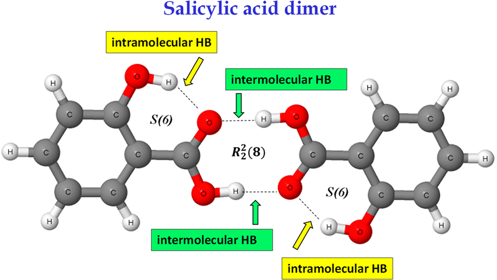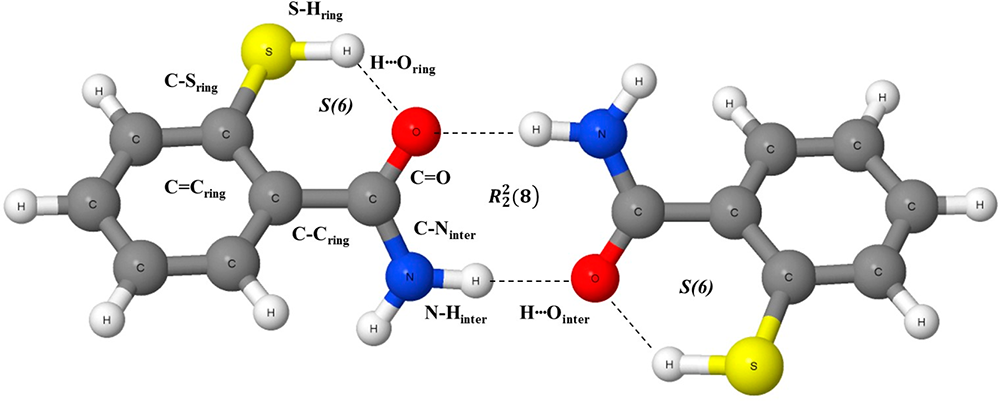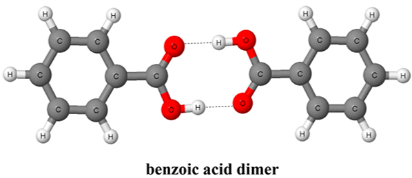 苯甲酸二聚体R?2(8)型八元环双氢键(O-H···O)。虚线表示氢键。DOI:10.1021/acs.jpca.0c11183