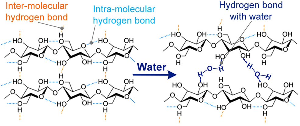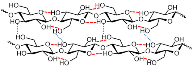 分子间氢键(蓝色虚线)与分子内氢键(红色虚线)存在于两条平行纤维素链之间。