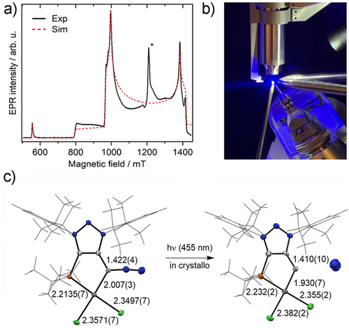b) X射线晶体学辐照装置示意图。 c) 在晶态反应前后单晶X射线结构及选定的键长。DOI:10.1002/anie.202516032