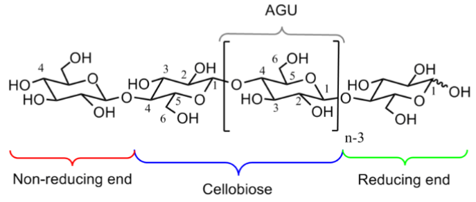 纤维素的分子结构。AGU代表一个无水葡萄糖单元,n代表聚合度。